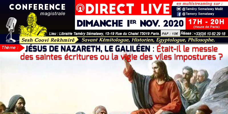 La librairie panafricaine TAMERY SEMATAWY, a accueilli ce DIMANCHE 1er Novembre 2020, de 17 H - 20 H, le Sech COOVI REKHMIRE, savant kémitologue, pour une conférence magistrale, sur le thème "JESUS DE NAZARETH, LE GALILEEN, ÉTAIT-IL LE MESSIE DES SAINTES ÉCRITURES OU LA VIGIE DES VILES IMPOSTURES ?".