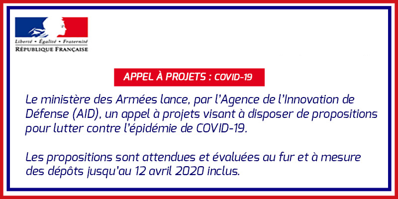 Le ministère français des Armées vient de lancer un appel à projets visant à disposer de propositions pour lutter contre l’épidémie de COVID-19. Les propositions étant attendues pour le 12 avril au plus tard, il est recommandé aux intéressés de soumettre leur proposition jusqu'au 30 mars 2020.